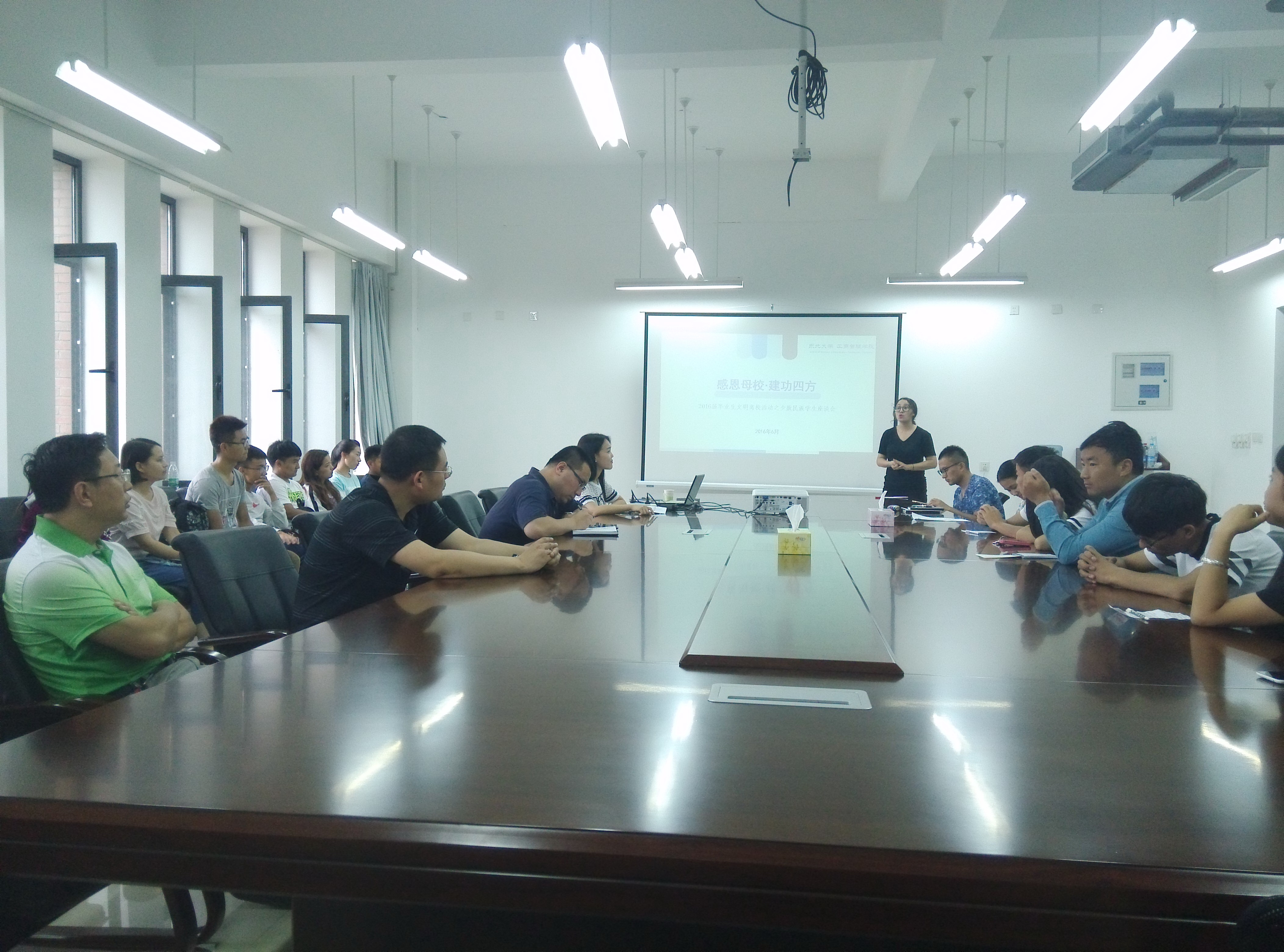 会议结尾,严立宁老师对2016届少数民族学生的在校表现给予肯定,祝贺大家顺利完成学业,并希望同学们能够秉承东北大学校训精神,勇于承担社会责任,建设家乡和祖国,同时与低年级的少数民族学生交流,鼓励大家以此为榜样,做好学业规划。