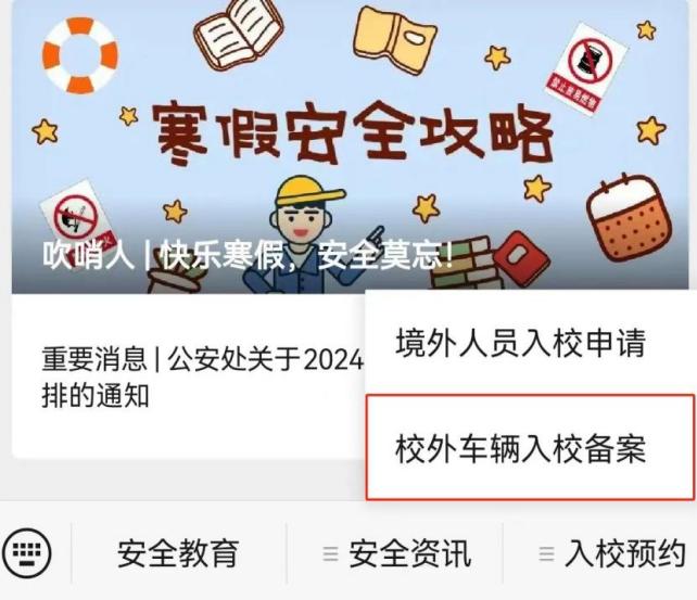 步骤二:点击“校外车辆入校备案”,填写信息并提交。提交成功后,会收到短信信息提示。